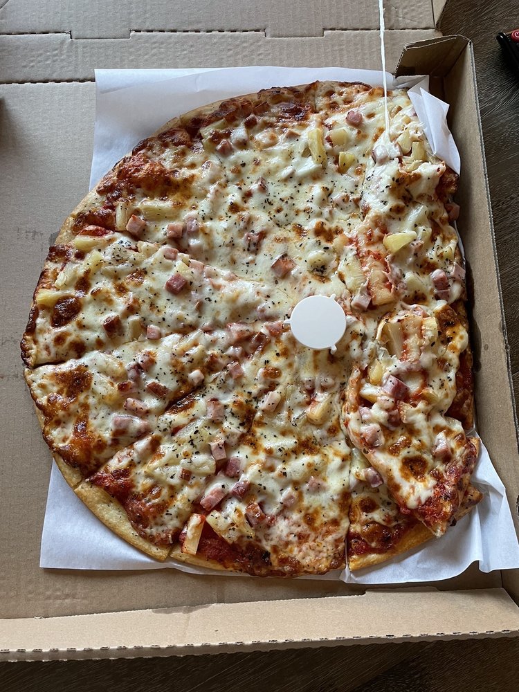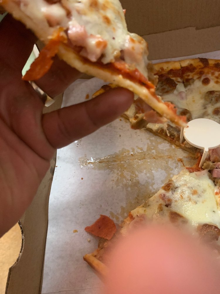 Pepperoni, sausage, ham, mushrooms, bell pepper, onion & black olive.